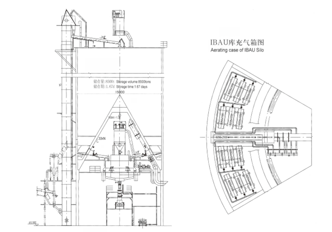 IBAU均化庫是我們南通江森機械制造有限公司采用德國尹堡公司的連續均化技術,經國產化設計在水泥行業得到廣泛應用的一款均化設備。均化庫的庫底中心設一大圓錐,庫內生料的重量通過該錐體傳遞給庫壁,庫底環形空間分成向中心傾斜10°的6個(或多個)充氣區,每個充氣區設一個卸料口,卸料口的上方用一個徑向放置的減壓錐將料層隔開,不讓卸料口上方的料流直接進入卸料口,整個環形區生料在各區中有兩個以自上而下切割水平料層的流動而產生重力混合均化的料柱,再經卸料口兩側形成料流的對流混合流向卸料口,圓錐下設外攪拌倉,各區的生料循環進入攪拌倉后,經連續強烈的充氣攪拌得到進一步均化。均化比為6-8,耗電為0.1-0.2kW/t。