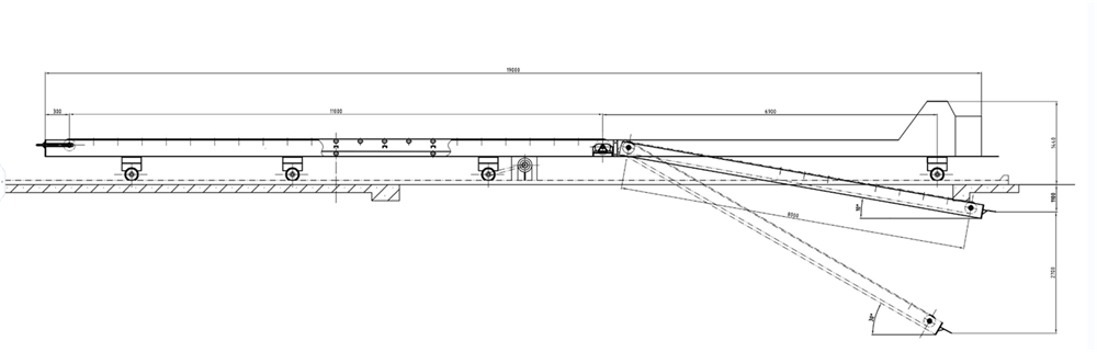 水泥袋自動裝車機由平形膠帶機、卸袋機構、端部溜槽、中間溜槽等組成。平形膠帶機的支架采用鋼板折彎結構,既美觀又牢固;驅動裝置采用擺線針輪減速機,節(jié)省占地面積,張緊方式為中間垂直螺旋張緊。卸袋機構由旋臂立式膠帶機、電動推桿和支架三部分組成;當不需要水泥袋從中間位置卸下時,立式膠帶機處于包裝膠帶的側邊。當需要水泥袋從中間位置卸下時,由電動推桿推動立式膠帶機使其擺動與包裝膠帶機縱向成交叉位置,并開動立式膠帶即可。立式膠帶機的兩個擺動極限位置設有限位開關,其在工作和非工作狀態(tài)下的定位由限位開關來實現(xiàn)。特殊設計的溜槽能使水泥袋恰好落到連續(xù)膠帶的中心位置。